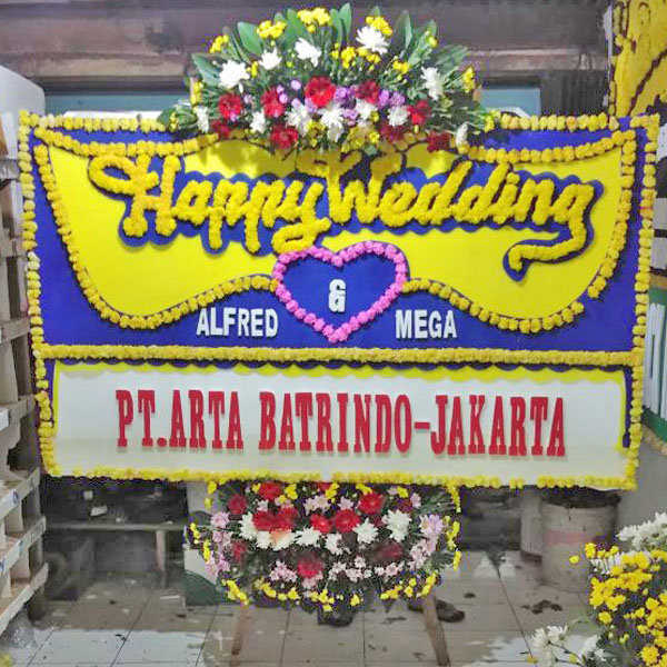 Bunga Papan Wedding ucapan Happy Wedding, Ukuran 2x1,25, Bunga Atas Bawah (Bunga Standar Lokal)