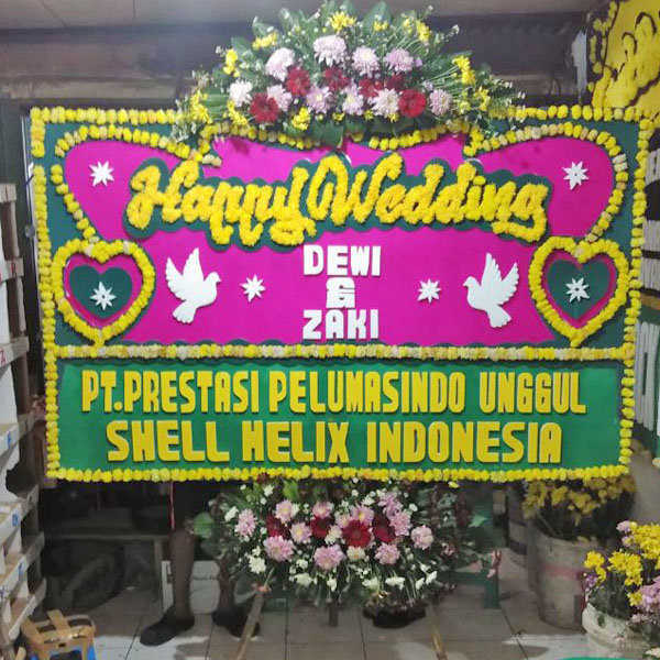 Bunga Papan Wedding ucapan Happy Wedding, Ukuran 2x1,25, Bunga Atas Bawah (Bunga Standar Lokal)