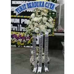 Bunga Standing Dukacita untuk ucapan turut berdukacita atau berbela sungkawa, terdiri dari bunga mawar dan bunga standar lainnya, standing dari besi.